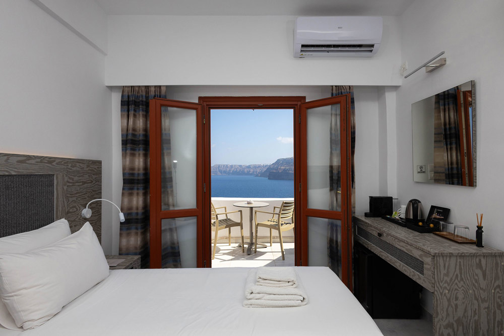 Η γραφική θέα στην Καλντέρα ο πρωταγωνιστής των Standard Δωματίων μας με Μπαλκόνι & Θέα στην Καλντέρα, προσφέροντας μια αξέχαστη απόδραση. Κάθε δωμάτιο μπορεί να φιλοξενήσει έως και 2 άτομα με ένα διπλό ή δύο μονά κρεβάτια μαζί με κλιματισμό, δορυφορική τηλεόραση, σεσουάρ μαλλιών, βραστήρα και ψυγειάκι, κι ένα ιδιωτικό μπαλκόνι που βλέπει στο μαγευτικό τοπίο της Σαντορίνης.